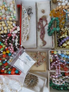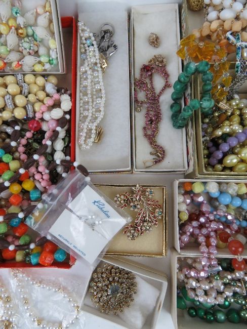 A large quantity of vintage costume jewellery inc Czechoslovakian white stone encrusted brooch, rings, faux pearls, etc.
