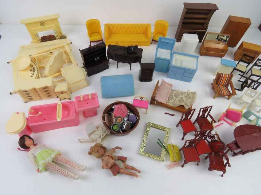 A quantity of vintage mid century wooden and other dolls house furniture including Dol-Toi items. Includes vintage jointed doll, other doll and baby in pram.