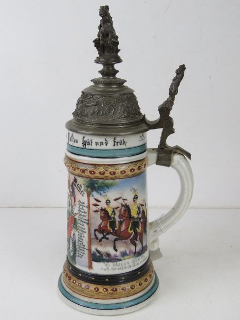 A military themed ceramic beer stein having Hussar on horseback with crest to handle, of German manufacture. All standing 30cm high. The base with lithophane.