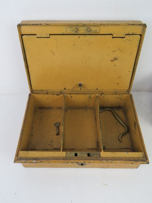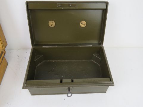 Two vintage cash boxes together with a small green painted cash box and a vintage wood lined box. Four items.