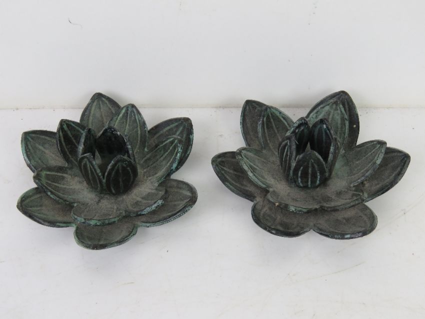 A pair of cast metal floral candle holders approx 11cm dia.