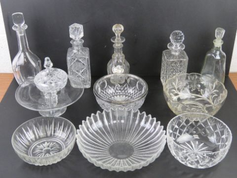 A quantity of assorted cut glass decanters and fruit bowls, etc. Also a ceramic Gin collar label.