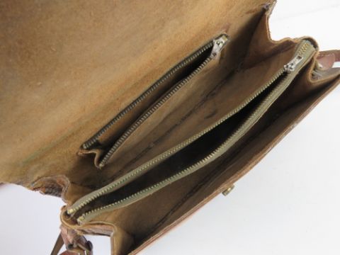 A tooled leather handbag made in Mexico by J L Vale, tan colour with floral design measuring approx 35cm wide. Together with two other similar bags. Three items.