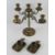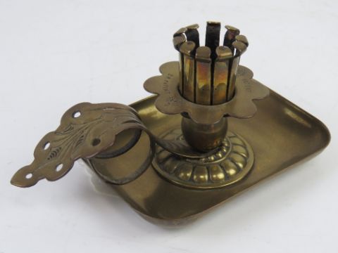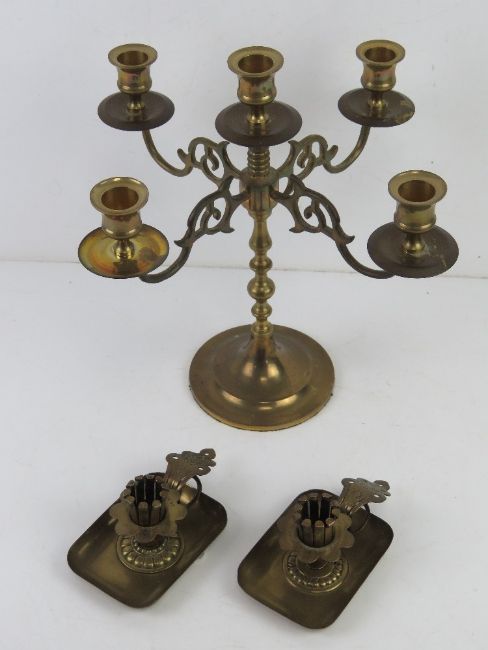 A brass fire sconce candelabra together with a pair of German brass chamber sticks.
