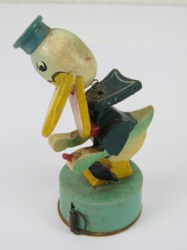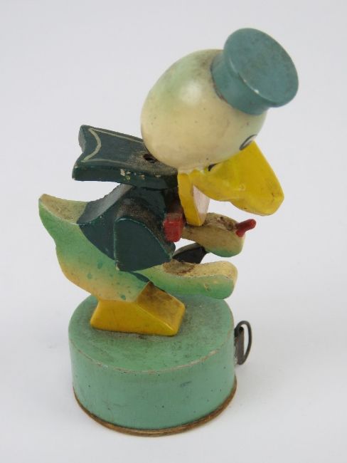 Sewing ephemera; A vintage fabric retractable tape measure in wooden casing in the form of a duck with sprung neck (possibly styled on Donald Duck), standing approx 9cm high.