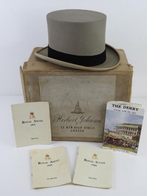 A grey felted top hat by Moss Bros of Covent Garden size 6 7/8 within Herbert Johnson 38 New Bond Street hat box. With Royal Ascot programmes for 1972, 1979 and 1986 as well as the Derby Epson June 4th 1975.
