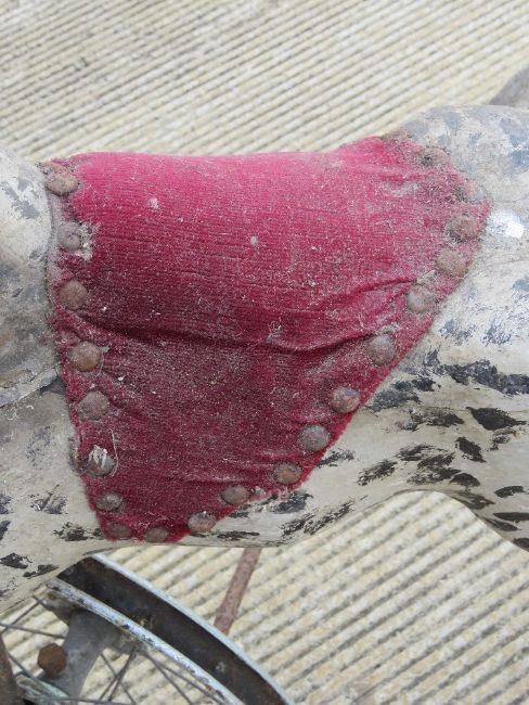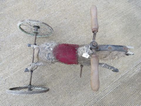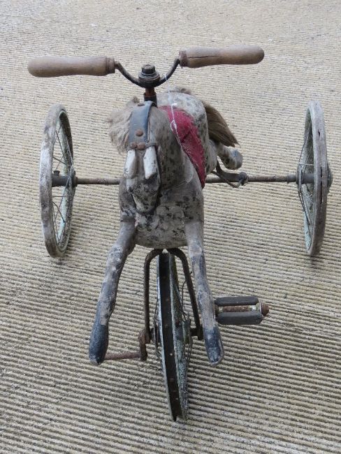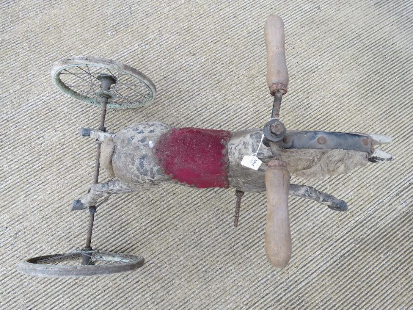 A delightful early 20thC child's tricycle in the form of a prancing pony. Steerable front wheel with pedals, twin turned wooden handle bar, a painted pony in the Appaloosa complete with studded 'velvet' saddle. Front wheel tyre deficient and one pedal missing. Approx 90cm (3 feet) total length and standing 69'' (27'' high).