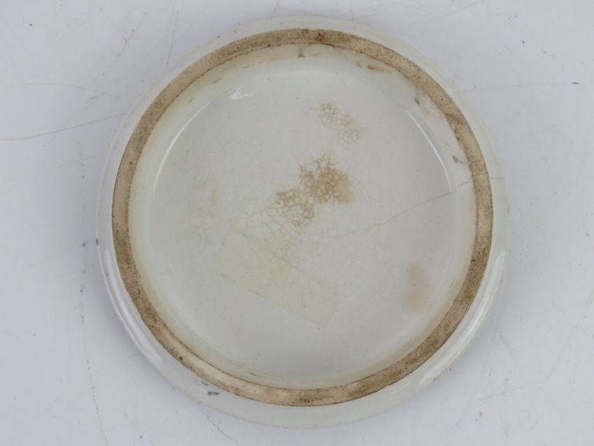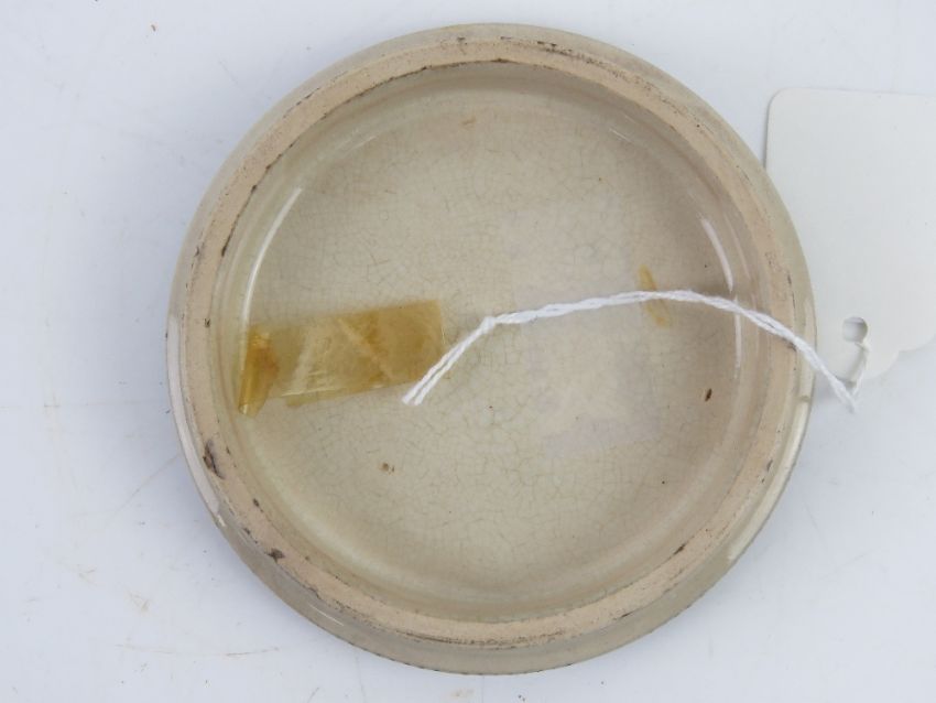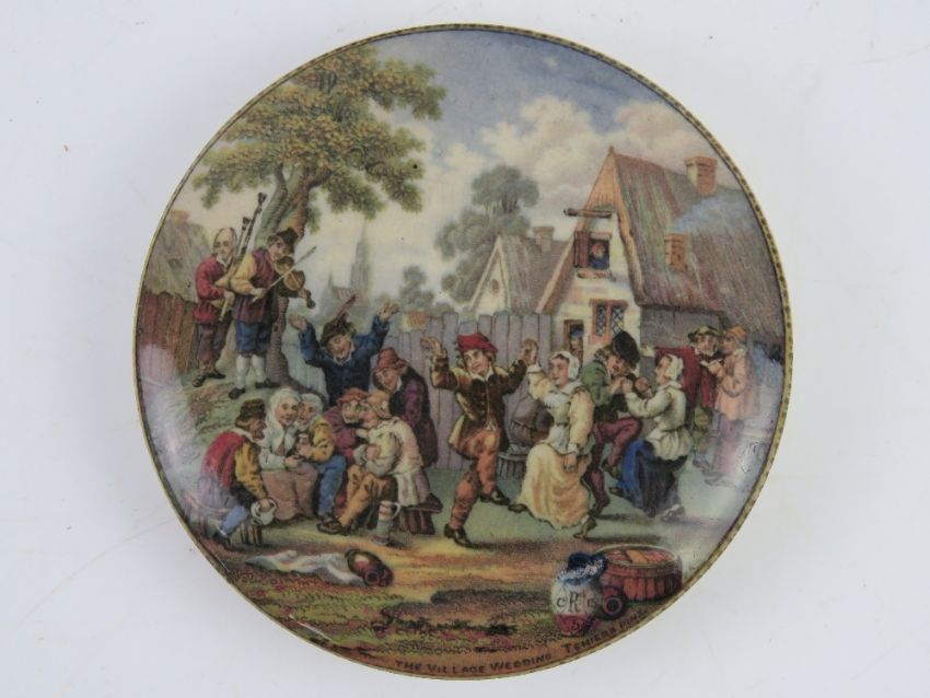 Two Pratt style ceramic pot lids 'Wimbledon July 2nd 1960' and 'The Village Wedding Teniers Pink', each 10.5cm dia.