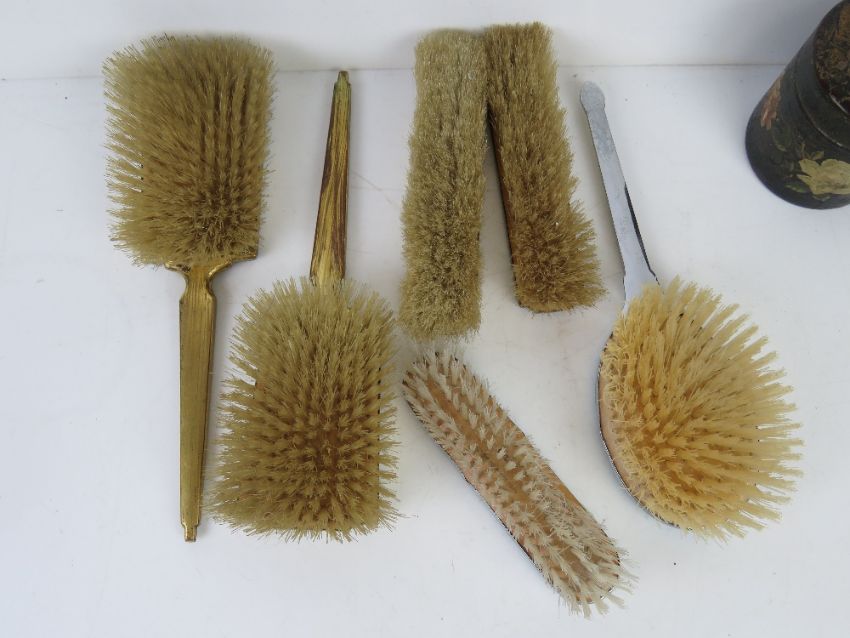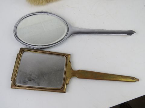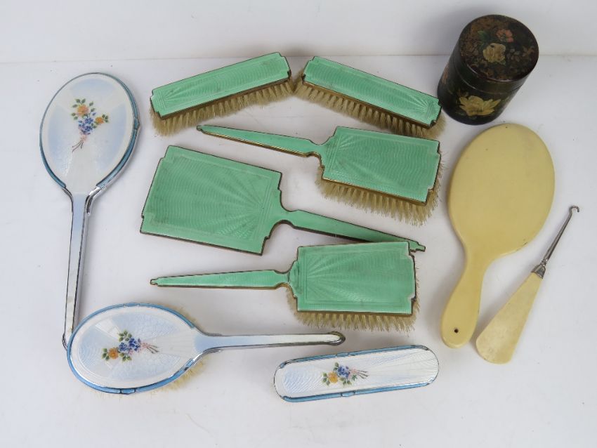 An Art Deco engine turned guilloche enamel dressing table set inc hand mirror, two hair brushes and pair of clothes brushes. Together with a quantity of other dressing table items inc enamelled and chromed hair brush, mirror and clothes brush set.