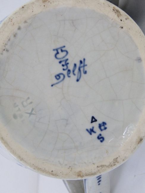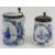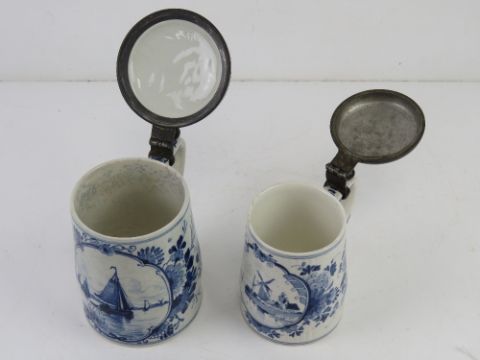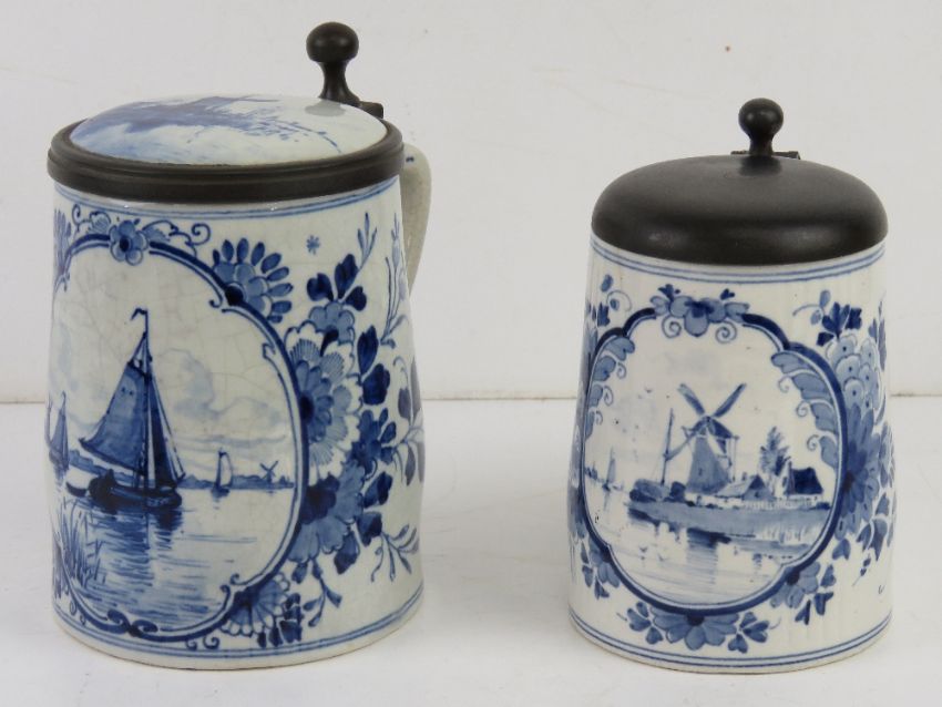 Two late 19th/early 20thC Delft lidded tankards, the larger having ceramic and pewter lid with windmill design upon, sailboat design to front, 15cm high, the other having pewter lid with windmill design to front.