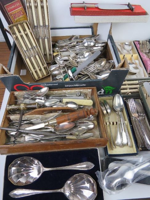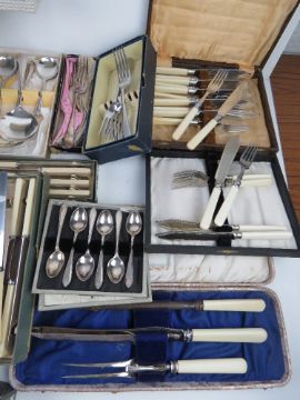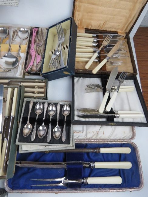 A large quantity of assorted flatware inc sets of silver plated cutlery.