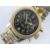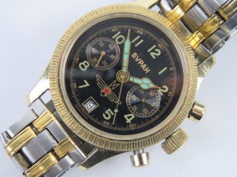 A Buran Chronograph Poljot 3133 wristwatch having black dial, two subsidiary dials, date aperture, and stainless steel strap.