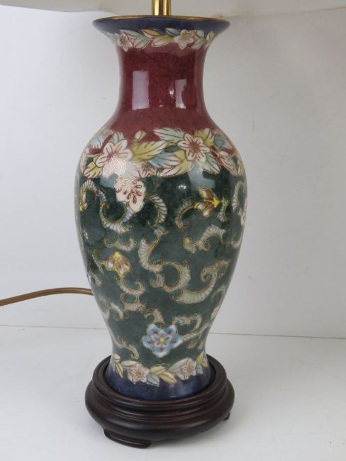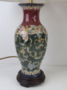 A brass table lamp raised over three outswept legs and having silk shade all standing 47cm high, together with another table lamp in the form of an Oriental vase, 60cm high. Two items, both for rewiring.