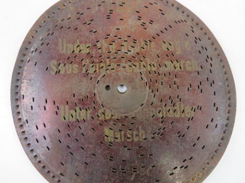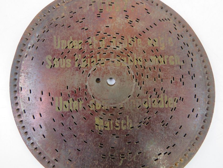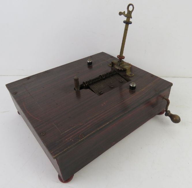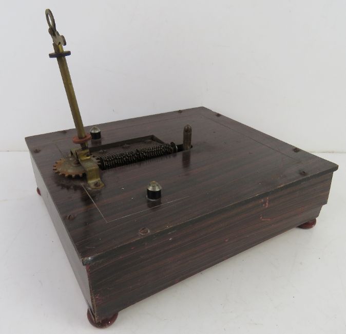 A Victorian tabletop symphonion, being rosewood effect pine box with hand cranked movement upon, with nine discs each 7.5" (19cm) dia and marked for Monopol. Base 23 x 20 x 7cm.