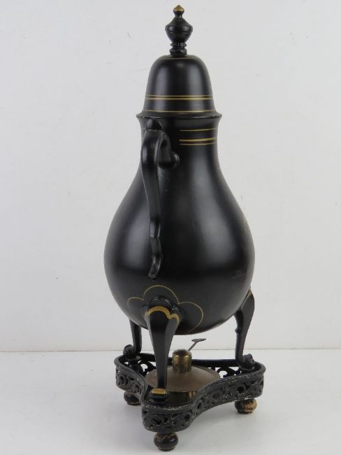 A 19thC pewter Dutch tole and Japanned tea urn of pear shape with an urn finial, the body with crane and applied shell decoration to the floral design, having indistinct inscription to lid, marked upon 'KDM Anno Daalderop 1880 Tiel Holland', all on tripod support with a brass tap and burner and standing 44cm high.