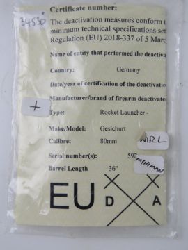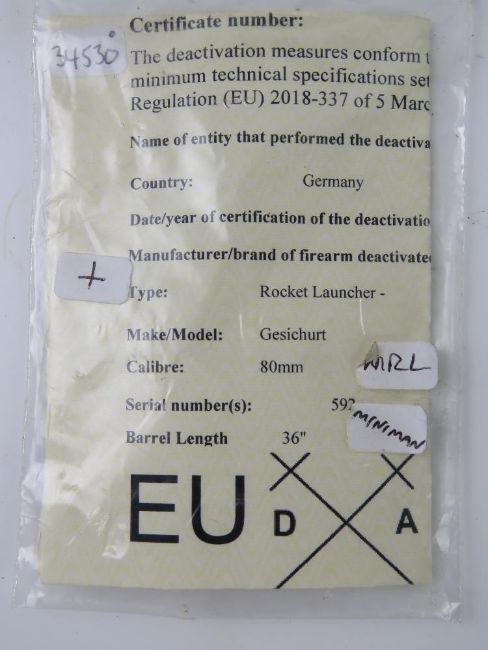 A deactivated Miniman 74mm Rocket Launcher having inert rocket inside, with firing mechanism and flip up sights. With certificate.