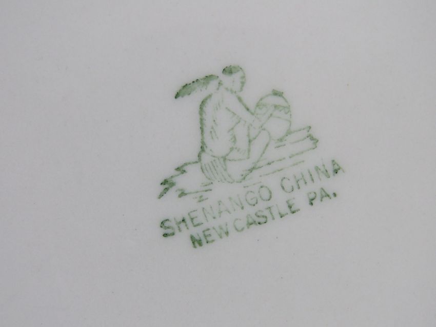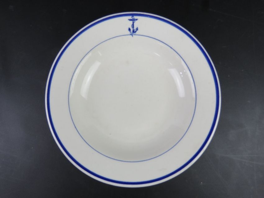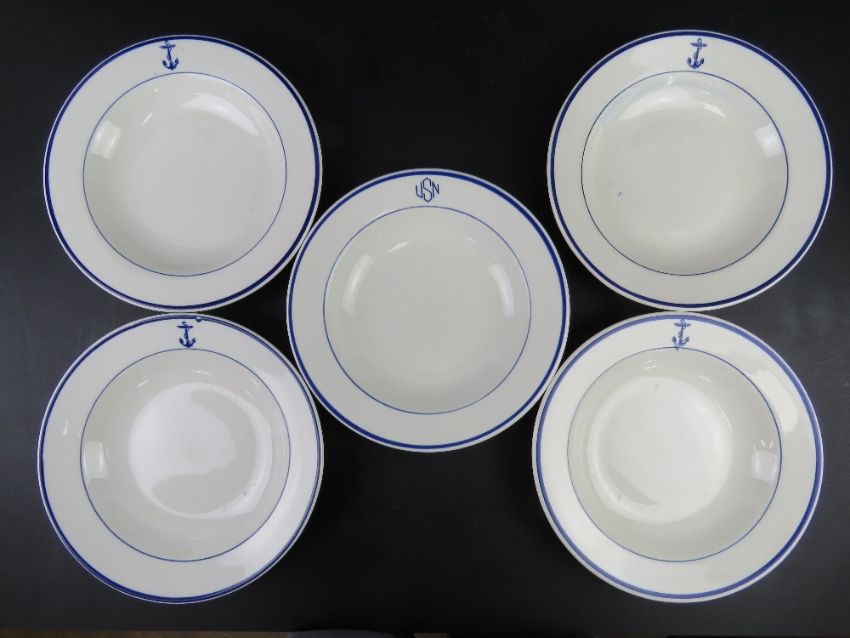 A US Navy officer's mess dish made by Shenango China Newcastle PA. Together with a set of four US Navy dishes having anchor design upon also made by Shenango China. Five items.