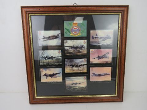 A framed set of Military themed 'Famous Bombers' cigarette cards.