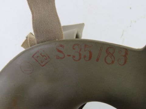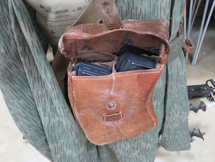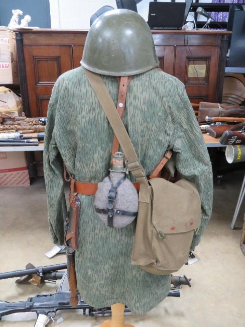 A Czech soldiers uniform on mannequin. Includes helmet with original liner, jacket, VZ58 ammo pouch which includes three magazines, bayonet frog, belt, Y-straps, shovel in carry pouch, water bottle, M10M size 2 gas mask in gas mask bag, and medical pouches.
