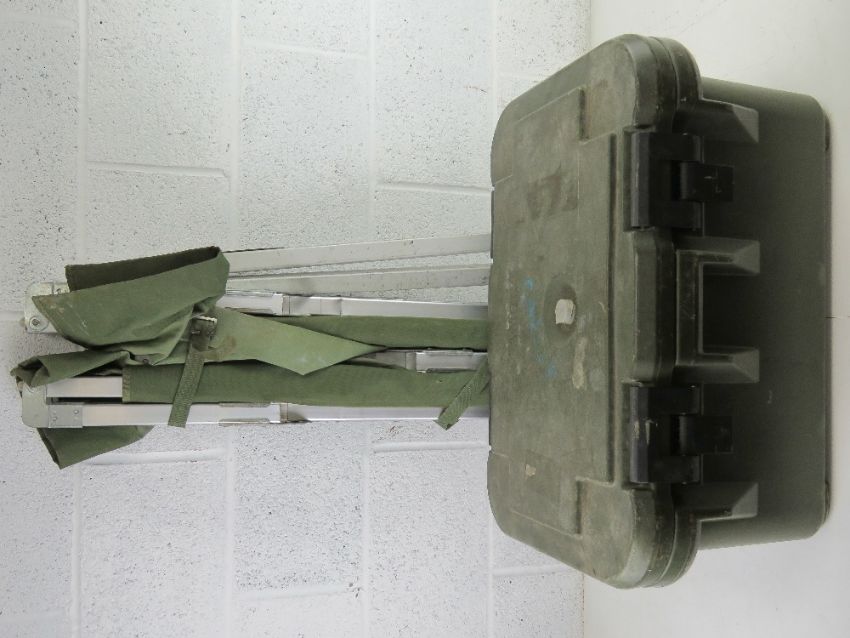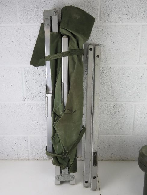 A British Military camp bed together with a British Military cooler box marked B Company 2 RW upon.