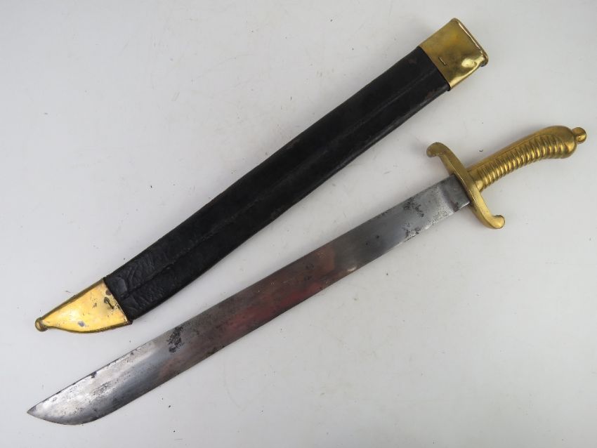 A Prussian Model 1855 Pioneer's Short Sword with scabbard, having cast brass and ribbed grip.