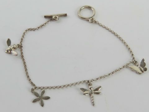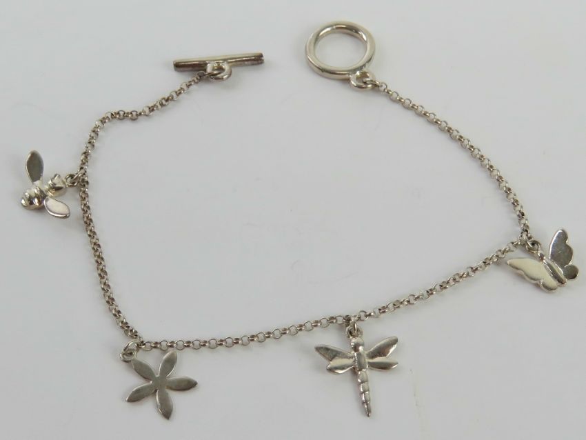 A silver charm bracelet having flower, dragonfly, bee and butterfly charms upon, stamped 925.