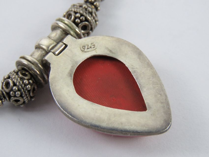 A silver and faux coral necklace having teardrop shaped pendant upon, stamped 925.