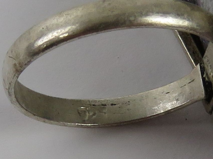 A handmade purple and black hardstone ring, the hemispherical agate approx 13 x 32mm, stamped 925, size R.