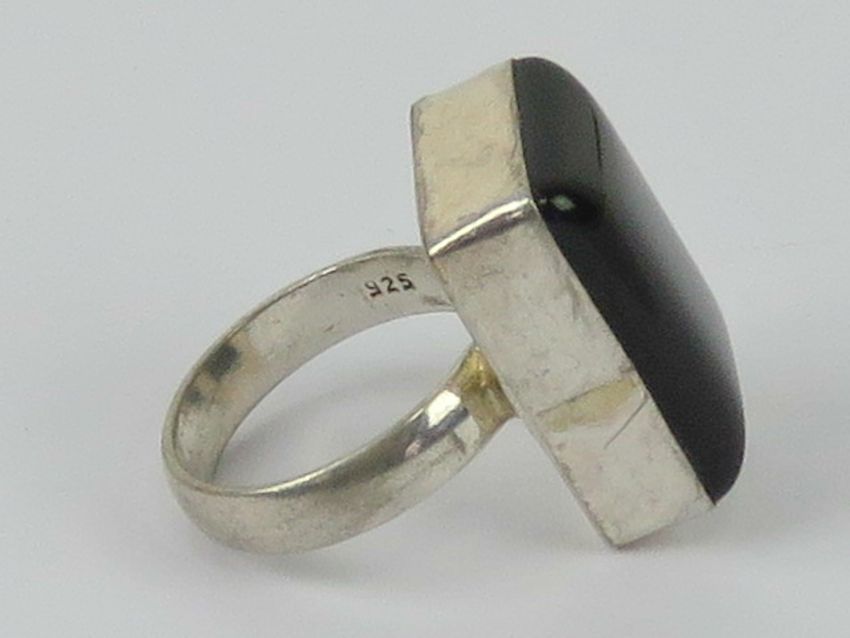 An onyx ring, the rectangular cabachon set in white metal stamped 925, size L-M.
