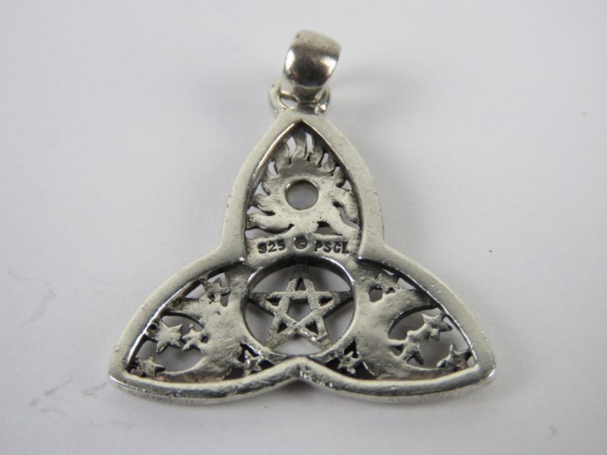 A silver Wiccan pentagram, crescent and moonstone pendant, stamped 925 and measuring 2.7cm wide.