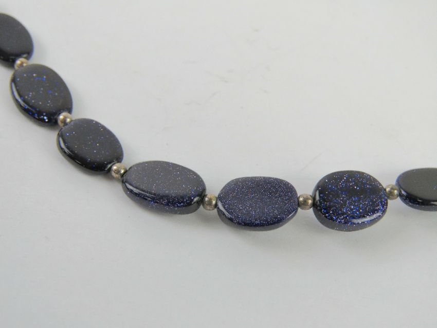 A blue gold stone beaded necklace with silver clasp stamped 925 approx 42cm in length.