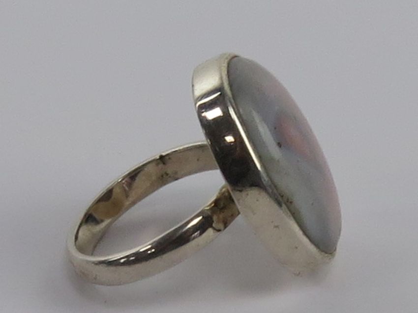 An unusual pink and lilac stone cabachon ring, stamped 925, size N.