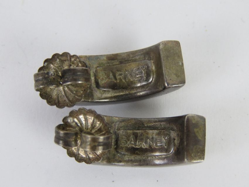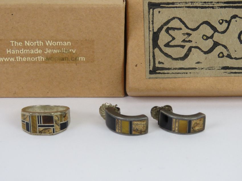 A Native American jewellery set with black onyx tiger's eye and jasper, unmarked white metal, marked for Barney, ring size R and half hoop earrings.