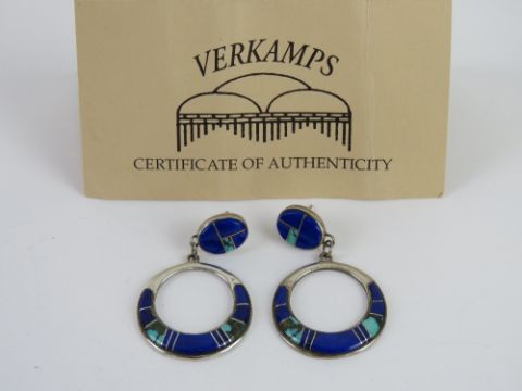A pair of Native American earrings set with turquoise and lapis lazuli, stamped Sterling with artist's name upon. Total length 5cm. With Verkamps Grand Canyon certificate of authenticity; Artist Zora Joe of the Navajo made with sterling silver and genuine stones.