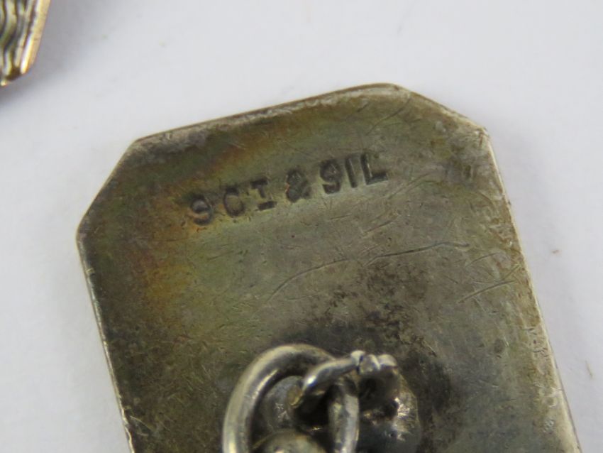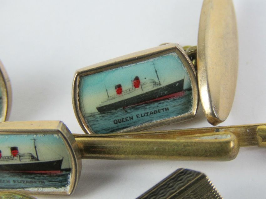 Two pairs of 9ct gold on silver cufflinks, together with a pair of Queen Elizabeth Ocean Liner cufflinks and tie pin.