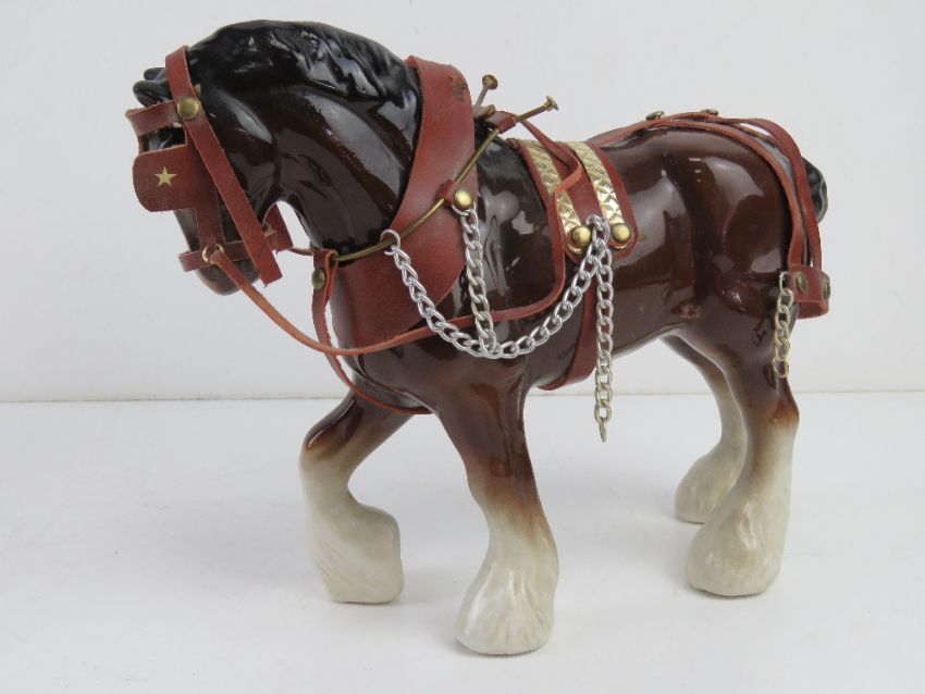 A German figurine of a horse together with another figurine of a Shire horse in bridle etc. Two items.