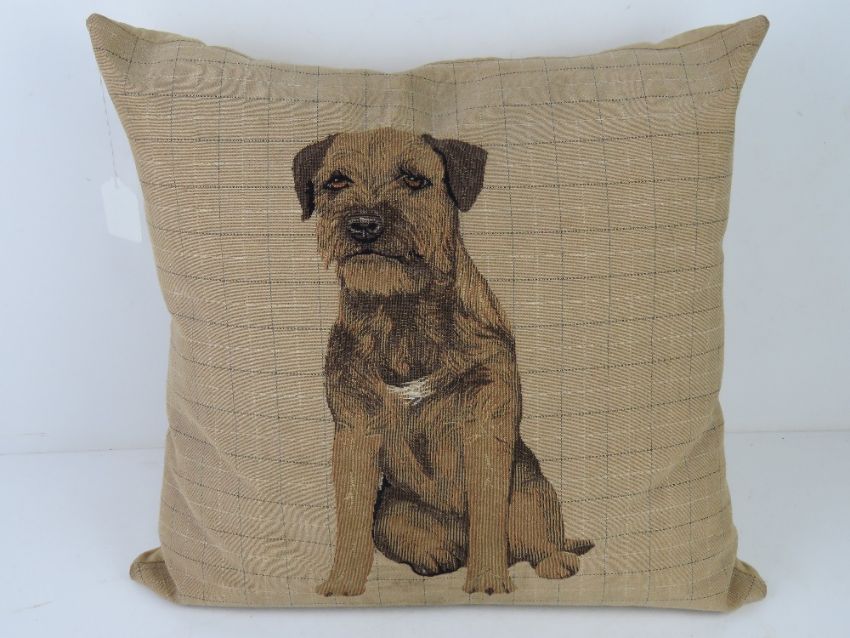 A throw cushion having terrier upon.