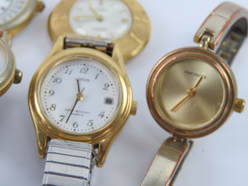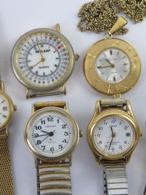 A ladies Zenith wristwatch on brown leather strap together with a quantity of other ladies wristwatches inc Waltham, Buler, Sealeaf, Seiko, etc. Eight items.