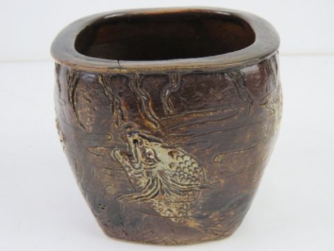 A Martin Brothers stoneware pot decorated with fish in brown ground, 9.5cm high.