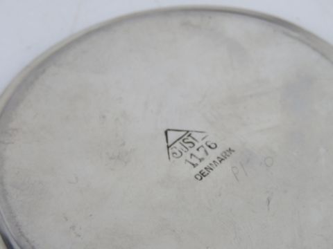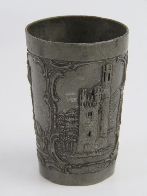 A carved wooden quaich together with a German pewter tot cup, a pewter tumbler by K T R and a pin tray with elephant design upon marked 'Just 1176 Denmark'. Four items.