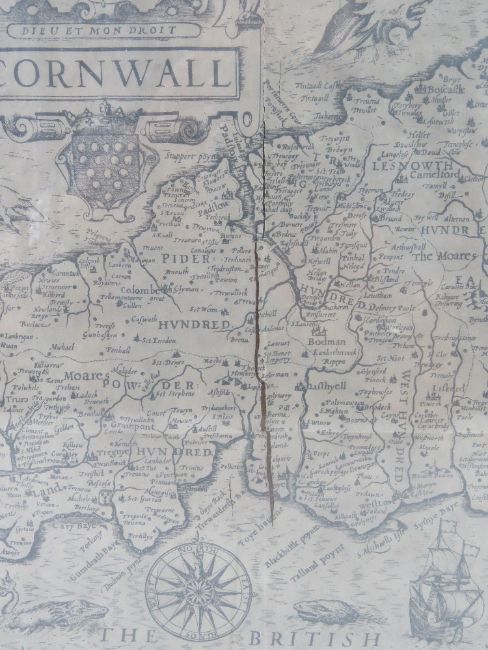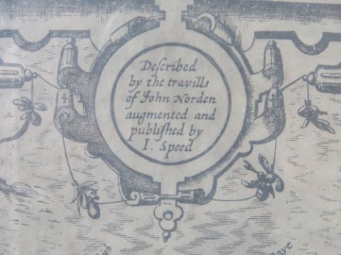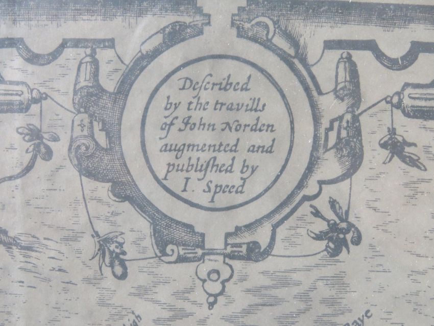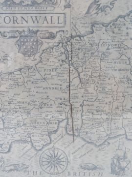 Map; Cornwall, published by John Speed, discoloured and a/f (cracking to right of centre), framed and in good heavily glazed frame, overall 54 x 40.5cm.
