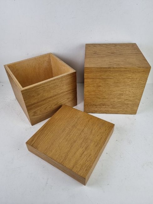 Two contemporary oak effect storage boxes each 25 x 25 x 25cm.