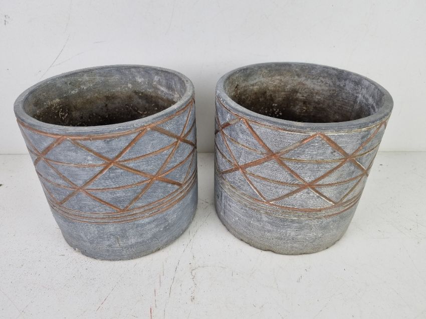 A pair of grey and copper coloured planters 16cm dia.