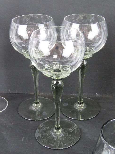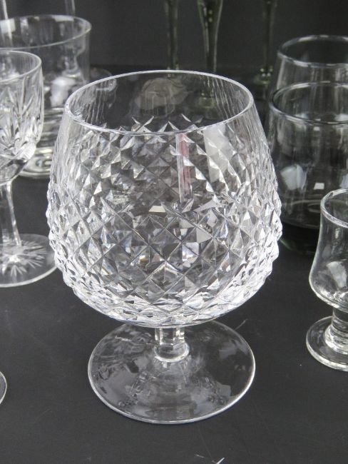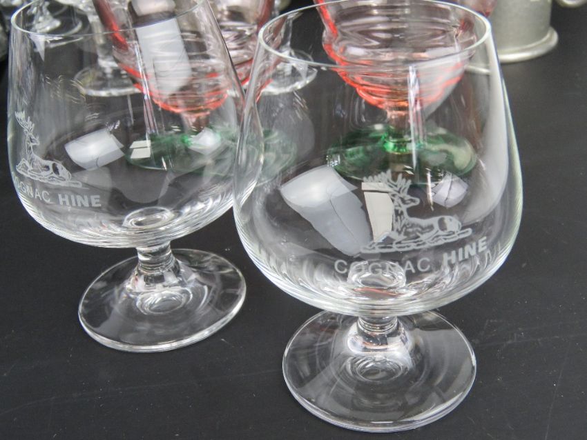 A large quantity of assorted glassware including a pair of pink and green lemonade goblets, a Waterford crystal cut glass brandy balloon, coloured stem hock glasses, cognac glasses, Darlington liqueur 'splash' design tot cups, Dartington goblet, Royal Masonic Hospital tumblers, etc.
