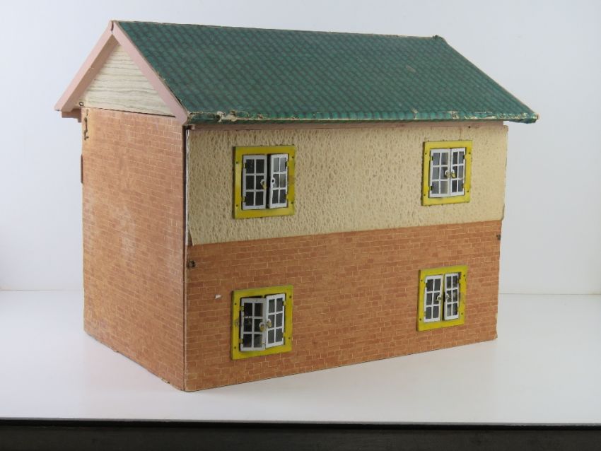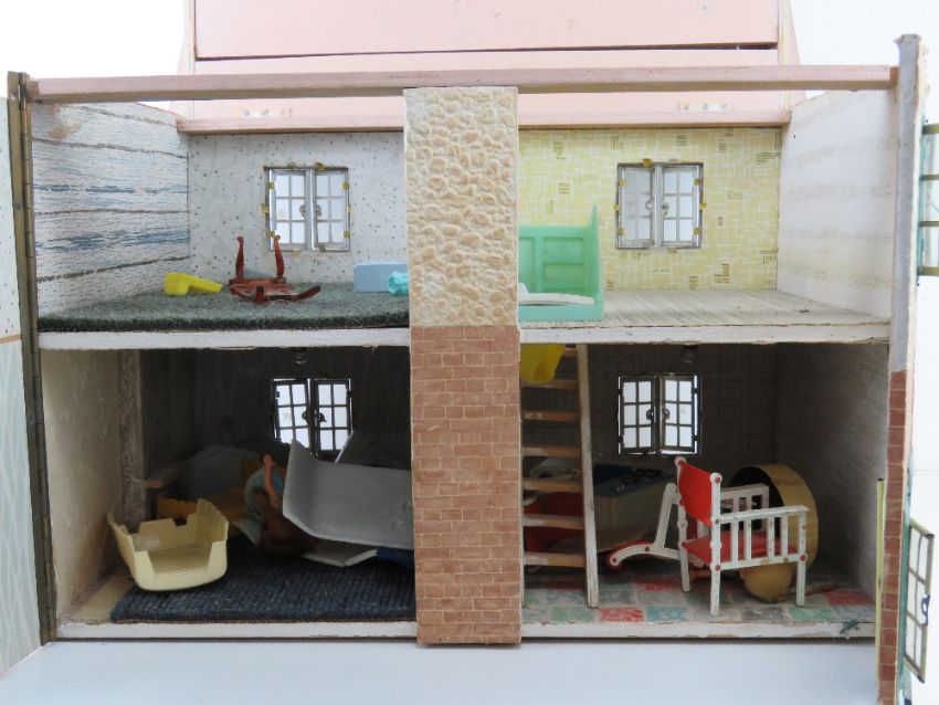A mid century dolls house having opening windows and door, some furniture within, 50cm wide.