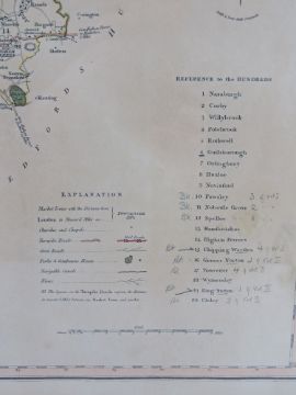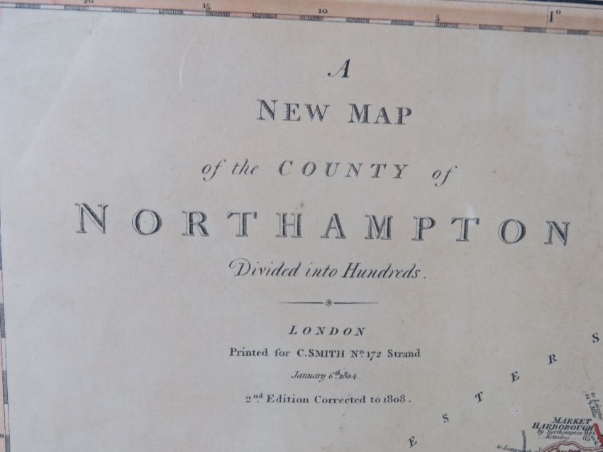 Map; A 'new map of the County of Northampton divided into Hundreds', London printed for C.Smith No 172 Strand January 6th 1804 Second edition corrected to 1808, having book fold to centre and pencil notes upon, handcoloured 52.5 x 46.5cm in frame 68.5 x 64cm