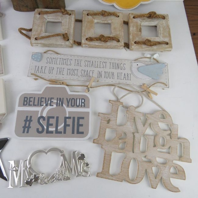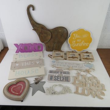 A quantity of assorted contemporary decorative signs and photo frames.