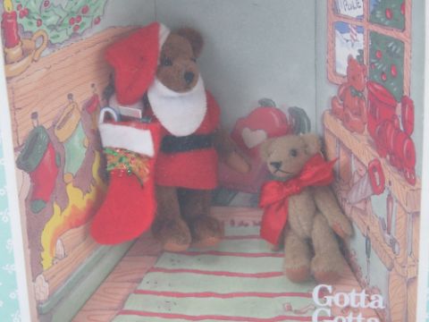 A diorama featuring two hand crafted jointed 'The Littlest Bears' by Gund.