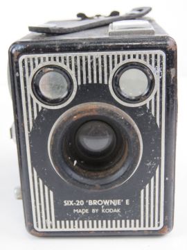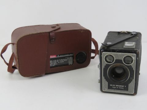 Two vintage cameras; Kodak 8 movie camera f/1.9, and a Kodak Six-20 'Brownie' E.
