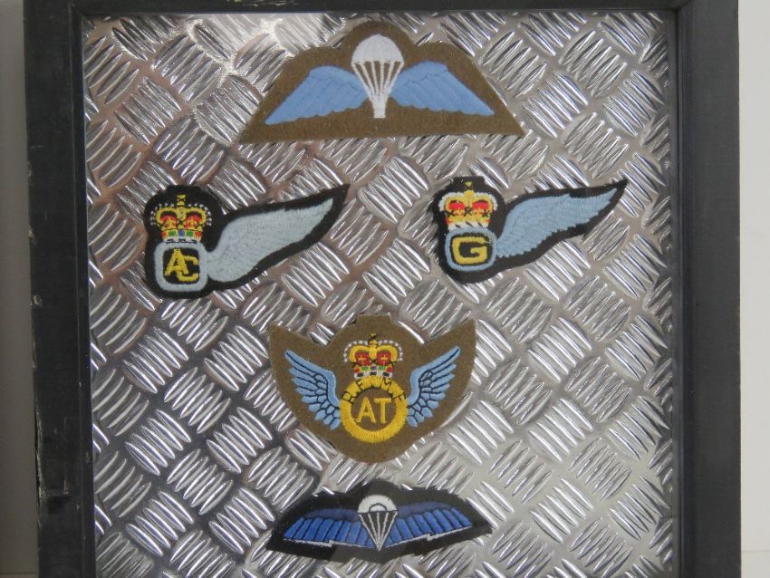 WWII Medals in framed box; 1939-1945 Star with original ribbon, War Medal with original ribbon. Together with two British RAF Parachute regiment displays, including miniature medals, airborne patches and cap badge.
